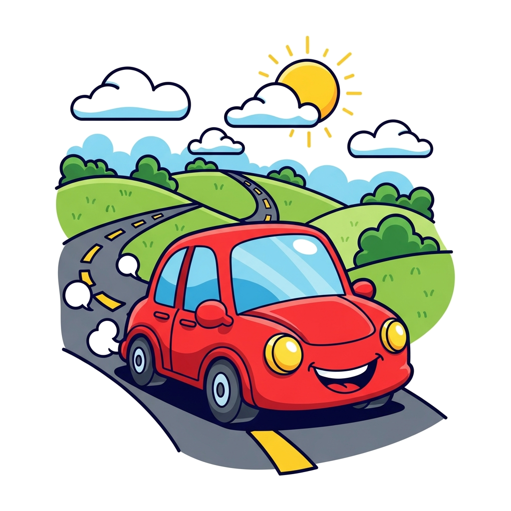 "A cheerful, smiling red cartoon car driving on a winding road through a sunny landscape with green hills and fluffy clouds, in a vibrant, playful illustration style for kids."