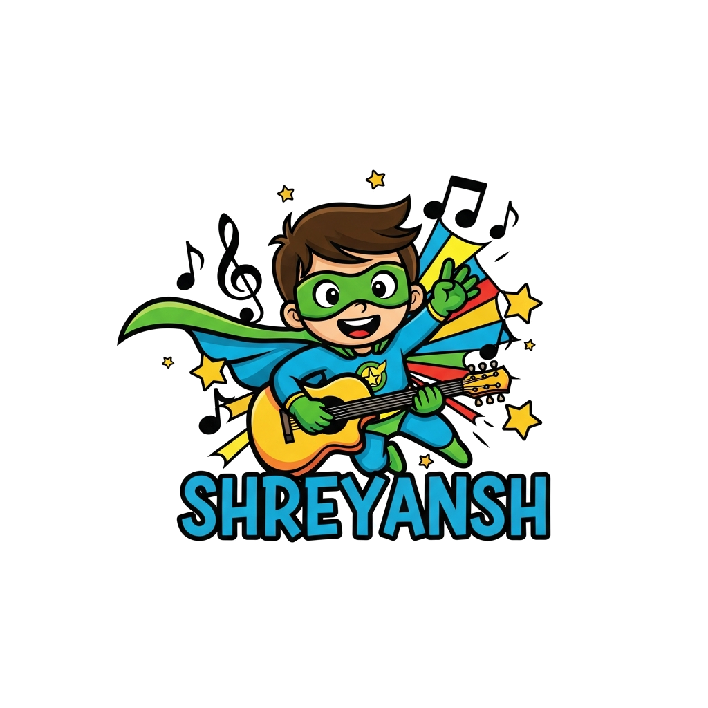 "A vibrant cartoon illustration of a cheerful superhero kid named 'Shreyansh' flying with a guitar, surrounded by musical notes and stars, in a dynamic and energetic style with a rainbow color palette of green, yellow, blue, and orange."