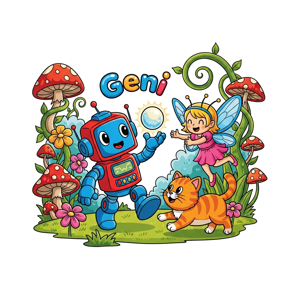 "A vibrant, cheerful scene with a cute, brightly colored cartoon robot playing with a friendly, stylized fairy and a playful animal (like a cat or a dog), all in a fantastical garden setting. The name 'Geni' is subtly integrated into the design with colorful, bubble-like letters."