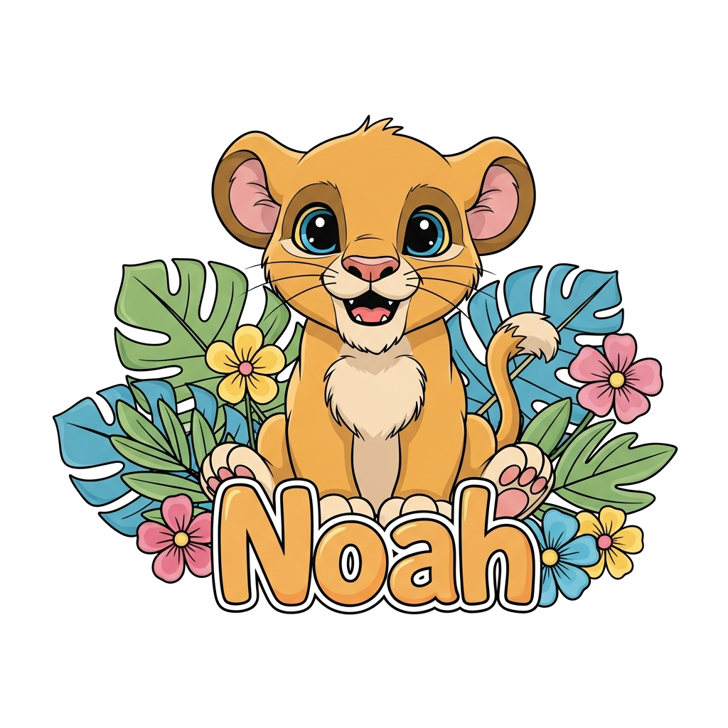 "A very cute and playful baby Simba cub, with big expressive eyes, sitting happily amidst vibrant, stylized jungle leaves and colorful cartoon flowers. The name 'Noah' is playfully integrated into the design with a friendly, bubbly font. Soft pastel colors, storybook illustration style."