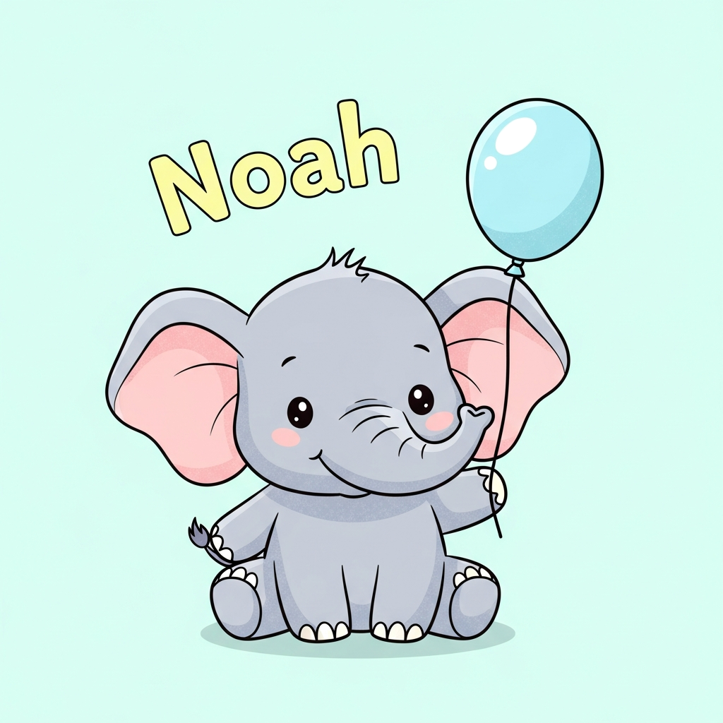 "A super cute, happy baby elephant cartoon character, with a gentle pastel grey body and soft pink inner ears, holding a pastel blue balloon. The name 'Noah' is written playfully above it in a soft pastel yellow, all in a sweet, joyful, and isolated graphic style with a light pastel background."