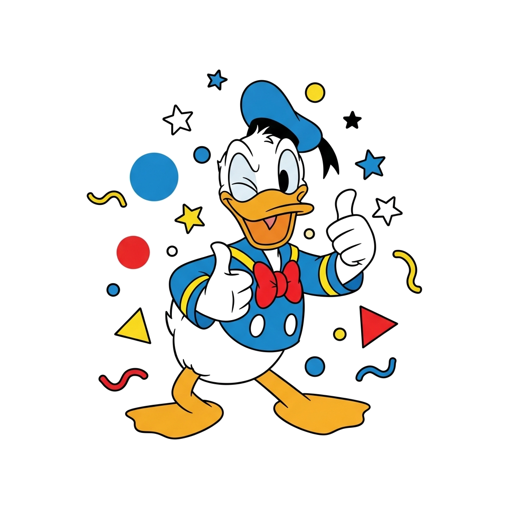 "A cheerful, classic Donald Duck character in a playful pose, maybe winking or giving a thumbs-up, surrounded by vibrant, abstract shapes and stars, in a clean cartoon style with bright primary colors."
