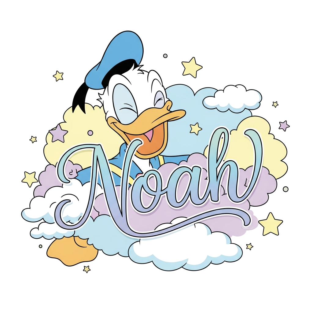 "A cheerful, classic Donald Duck character in a playful pose, winking, surrounded by soft, dreamy pastel clouds and floating stars. The name 'Noah' is elegantly integrated in a flowing script, crafted from pastel blue and lavender hues, within the whimsical background elements. Clean cartoon style, with a dominant palette of light blues, soft pinks, gentle yellows, and lavender."