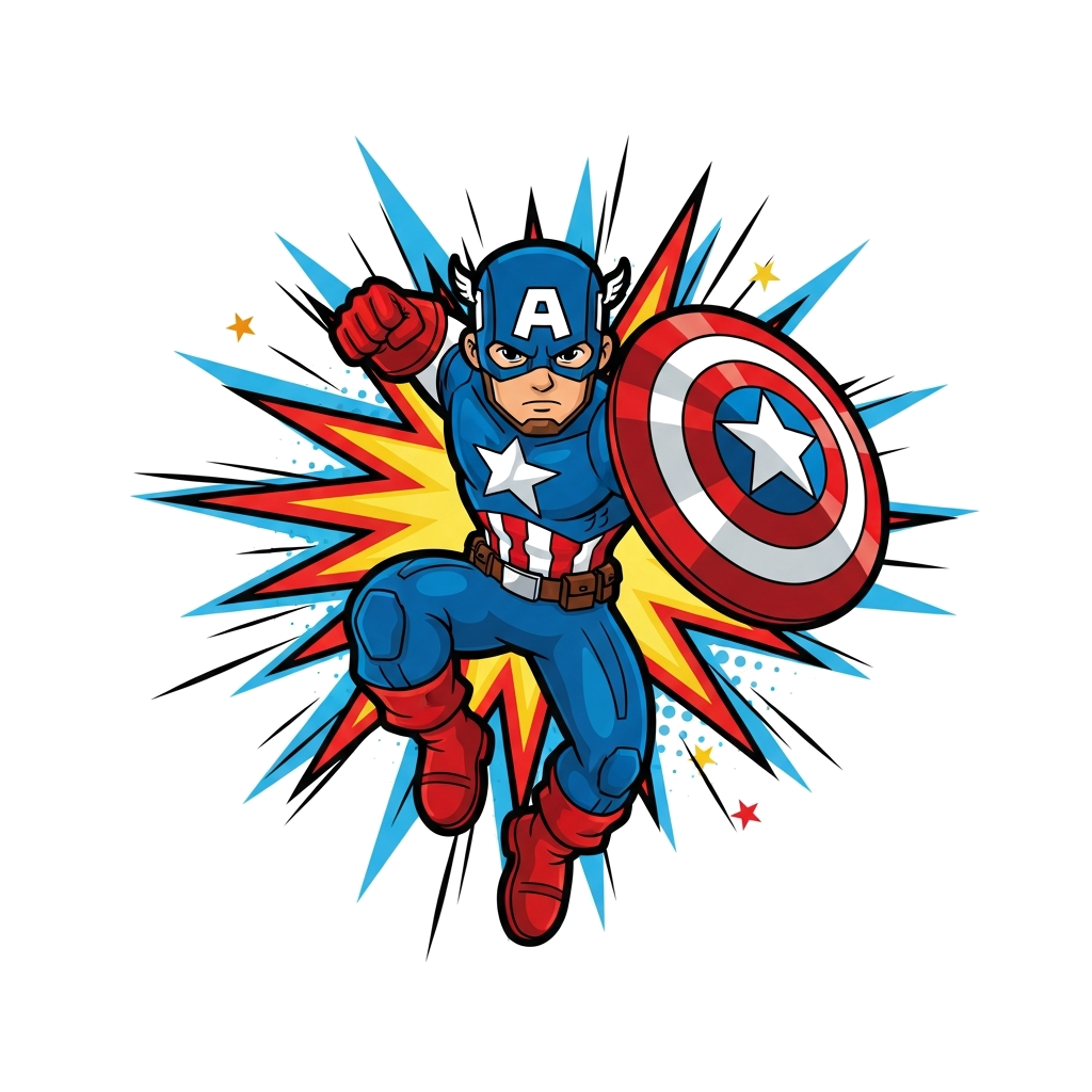 "A bold and dynamic cartoon Captain America mid-leap, shield in hand, with a powerful, heroic pose against an exploding starburst background, vibrant comic book colors, child-friendly illustration style."