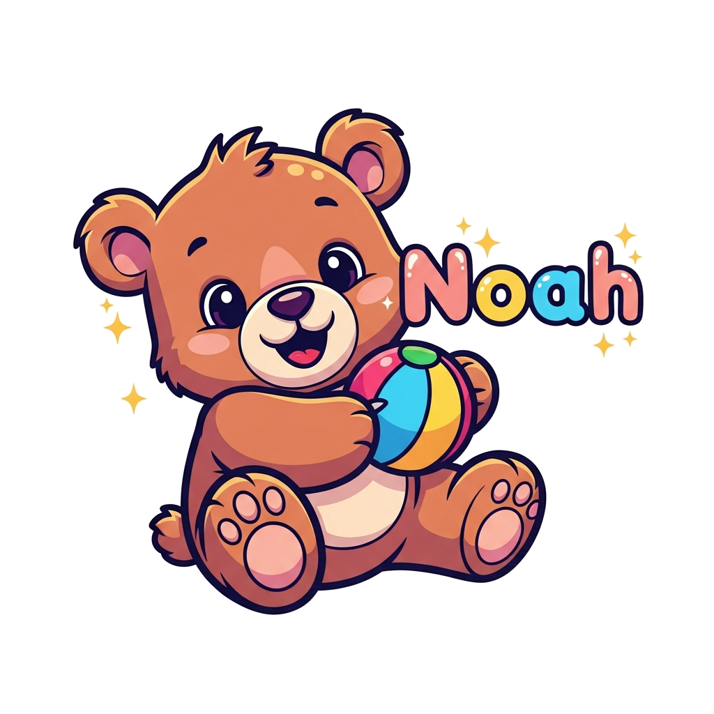 "A super cute and bubbly cartoon bear cub, with big friendly eyes and a happy smile, playing with a colorful ball. The name 'Noah' is playfully incorporated into the design with a soft, rounded font, surrounded by tiny sparkling stars, in a vibrant, cheerful animation style."