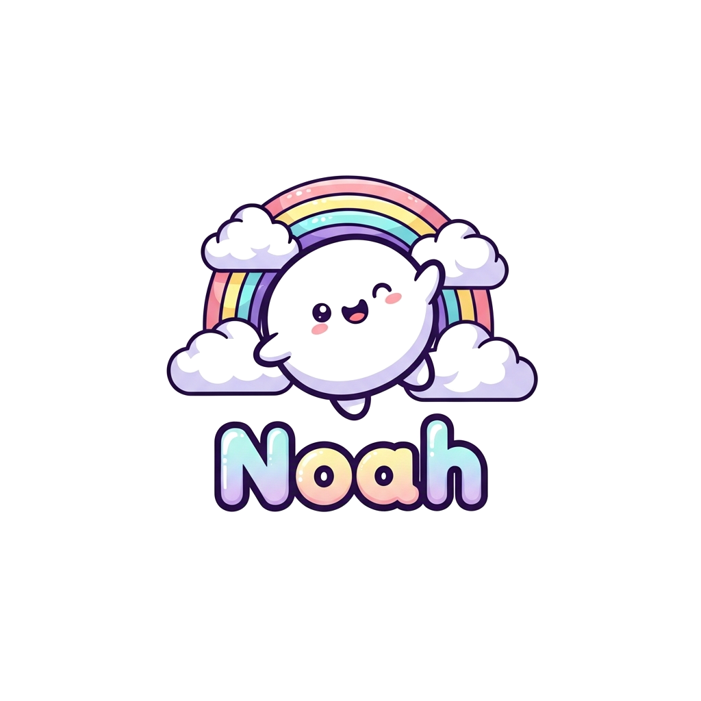 "An adorable, round, marshmallow-like cartoon character with tiny arms and legs, floating happily among fluffy clouds and a pastel rainbow. The character is waving, and the name 'Noah' is written below in a bouncy, cute font, all in a soft, bubbly animation style with gentle gradients."