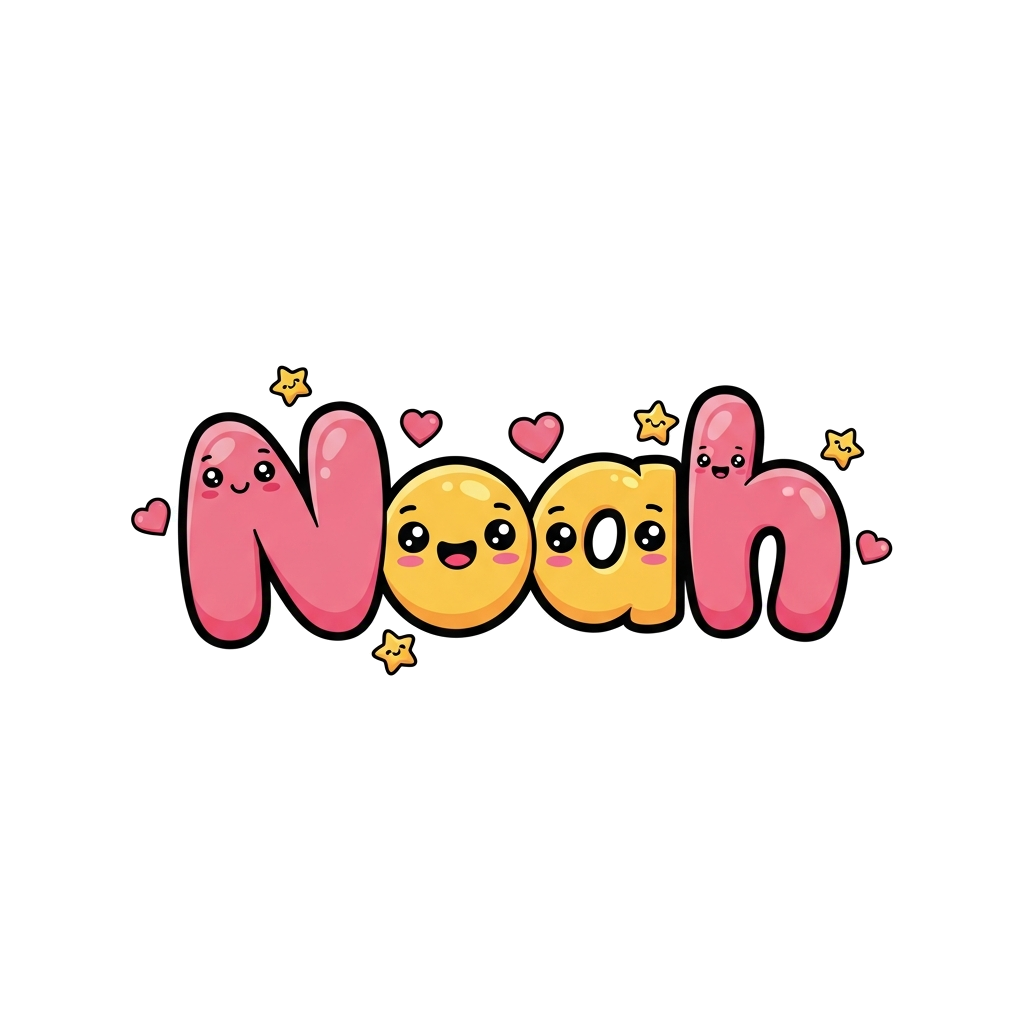 "The name 'Noah' rendered in a very cute, bubbly, and slightly squishy cartoon font, where each letter has a friendly face and small expressive eyes. Little animated stars and hearts are playfully bouncing around the letters, in a bright and cheerful color palette, looking like it jumped straight out of a children's animated show."