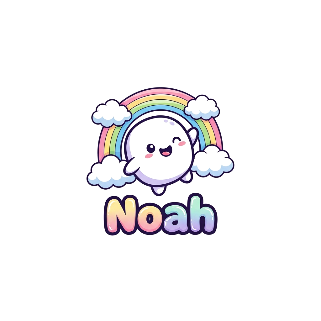 "An adorable, round, marshmallow-like cartoon character with tiny arms and legs, floating happily among fluffy clouds and a pastel rainbow. The character is waving, and the name 'Noah' is written below in a bouncy, cute font, all in a soft, bubbly animation style with gentle gradients."