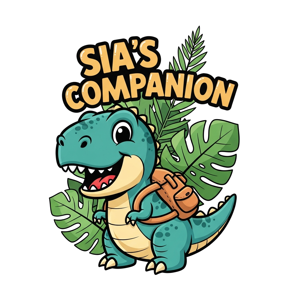 "A cute cartoon baby T-Rex smiling, wearing a tiny backpack, with the text 'Sia's Companion' playfully integrated into the background with jungle leaves, vibrant and friendly style."