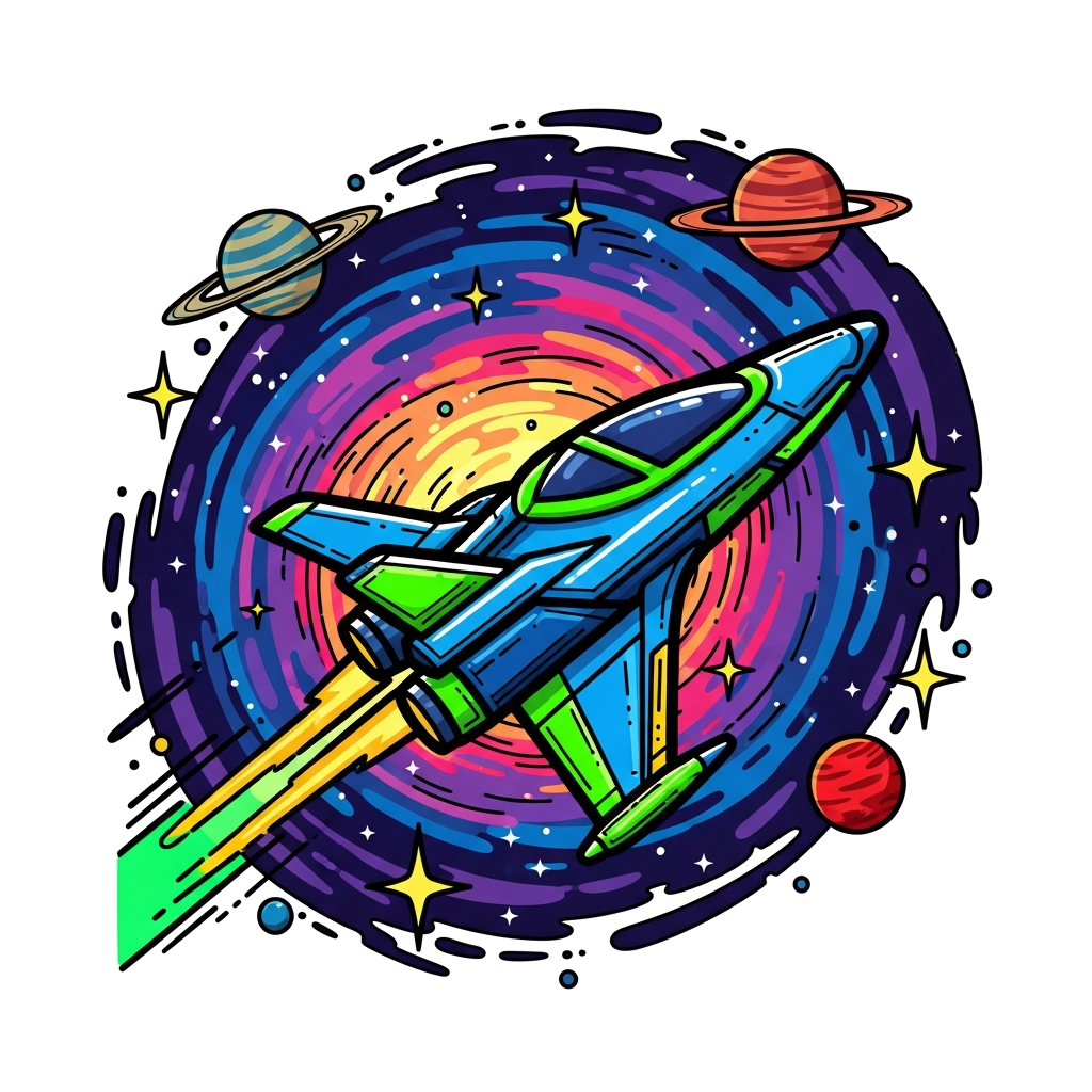 "A dynamic and vibrant illustration of a futuristic spaceship soaring through a swirling, multi-colored nebula, surrounded by glowing stars and distant planets, in a bold and energetic cartoon style."