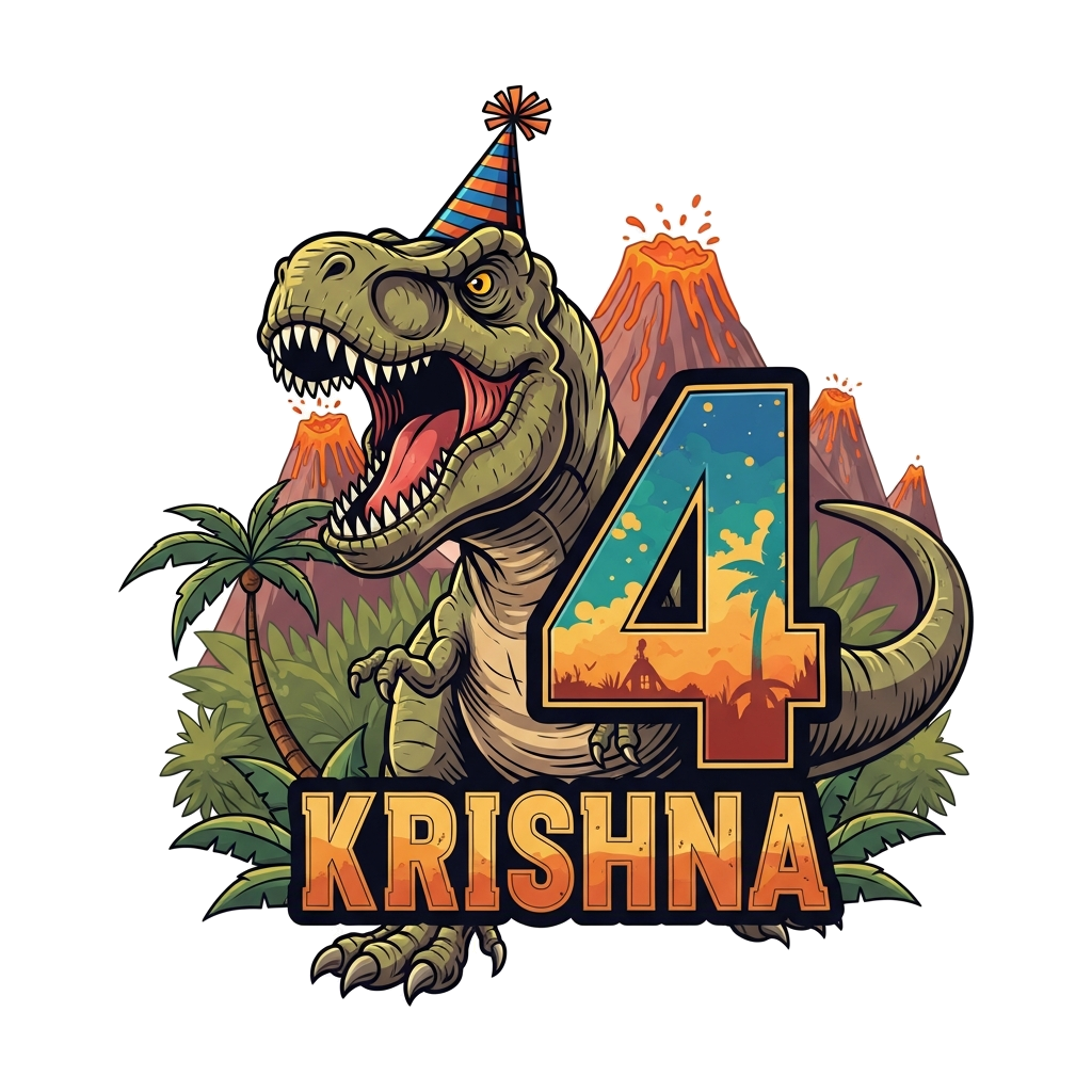 "A bold and friendly cartoon Tyrannosaurus Rex, wearing a cool party hat, roaring excitedly next to a large, stylized number '4'. The name 'Krishna' is integrated below in an adventurous, prehistoric-inspired font. Rich jungle background with volcanic peaks, vibrant colors, strong lines, adventurous illustration style."