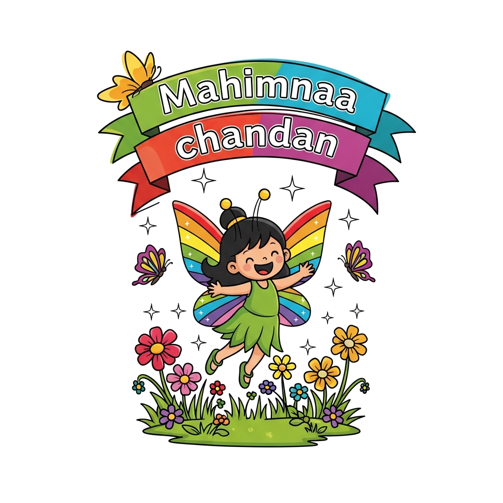 "A vibrant cartoon illustration of a joyful fairy with rainbow wings, surrounded by sparkling flowers and butterflies, in a magical garden. The name "Mahimnaa chandan" is playfully incorporated into a colorful banner above the fairy."