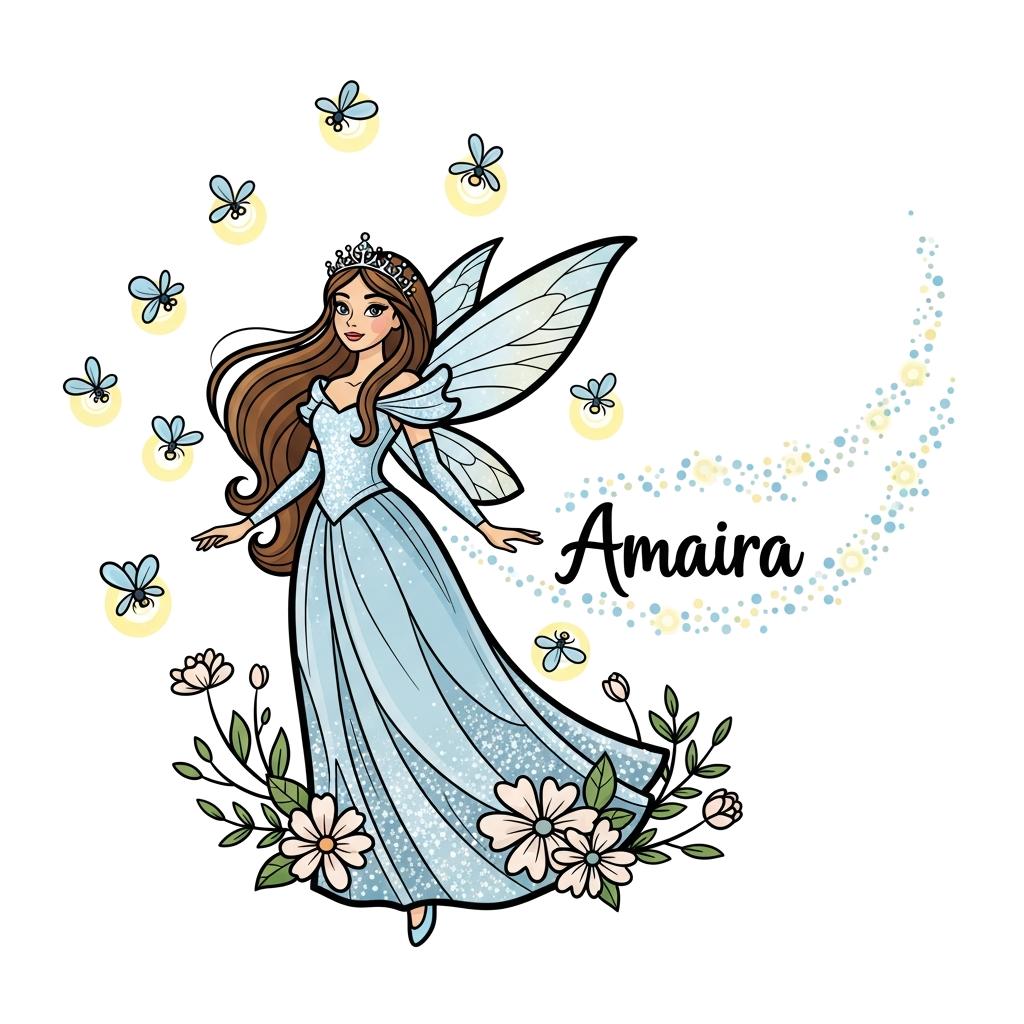 "A graceful fairy princess with long flowing hair, wearing a shimmering gown, surrounded by magical glowing fireflies and delicate flowers, in a soft, dreamy watercolor style with the name 'Amaira' subtly integrated into a magical trail."
