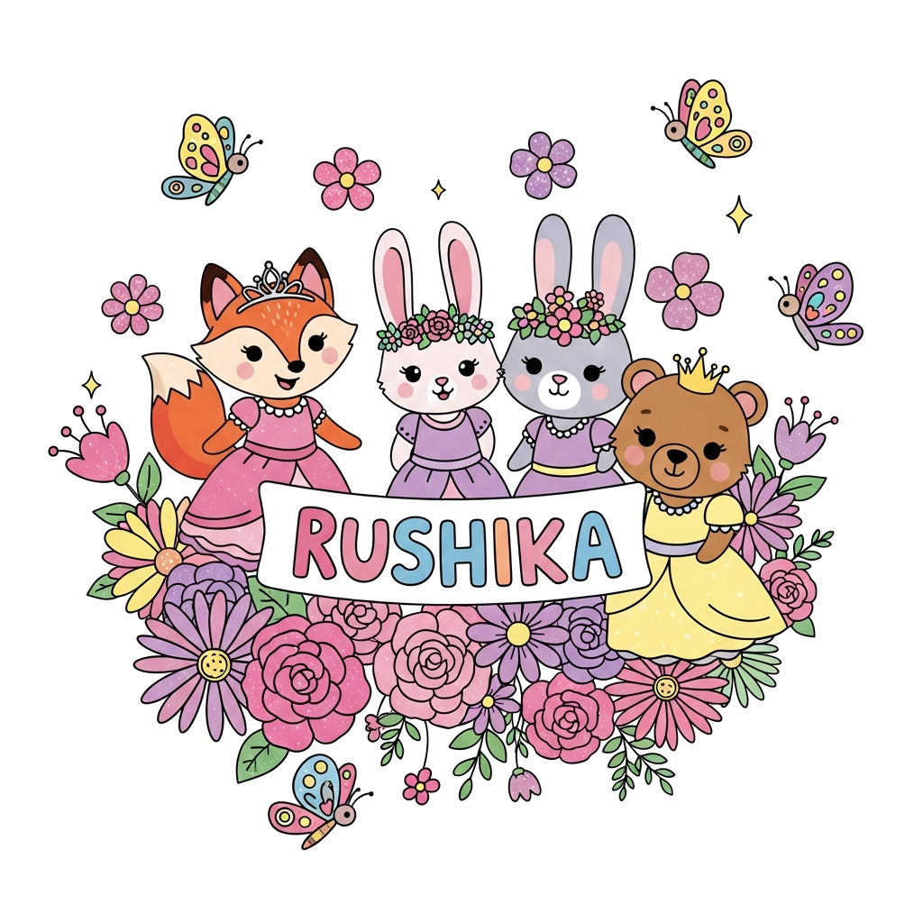 "A whimsical illustration of a diverse group of cartoon animals (like a fox, bunny, and bear) dressed as princesses, celebrating with a banner that says 'Rushika', surrounded by pink, purple, and rainbow flowers and butterflies, in a cute, vibrant, and pastel style."