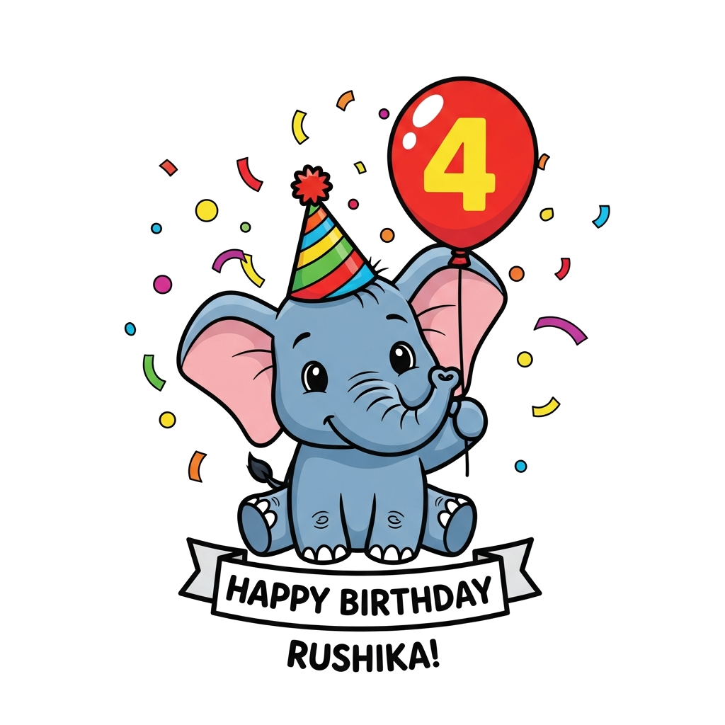 "A super cute cartoon baby elephant wearing a party hat, holding a balloon with the number '4' on it, surrounded by colorful confetti and a small banner saying 'Happy Birthday Rushika!', vibrant and playful style."