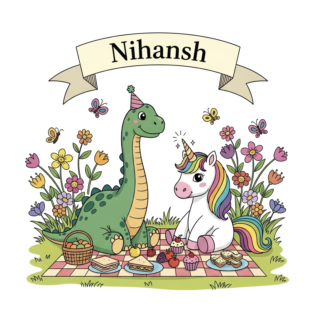 "A playful cartoon design where a friendly dinosaur and a graceful unicorn are having a picnic in a sunny meadow, surrounded by butterflies and blooming flowers, with a banner above them that reads 'Nihansh' in a charming, handwritten font."