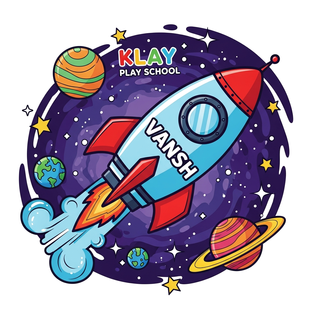 "A bold and cool illustration of a futuristic rocket ship with 'Vansh' written on its side, flying past planets and stars, with 'Klay Play School' subtly integrated into the cosmic background, vibrant and dynamic digital art style."