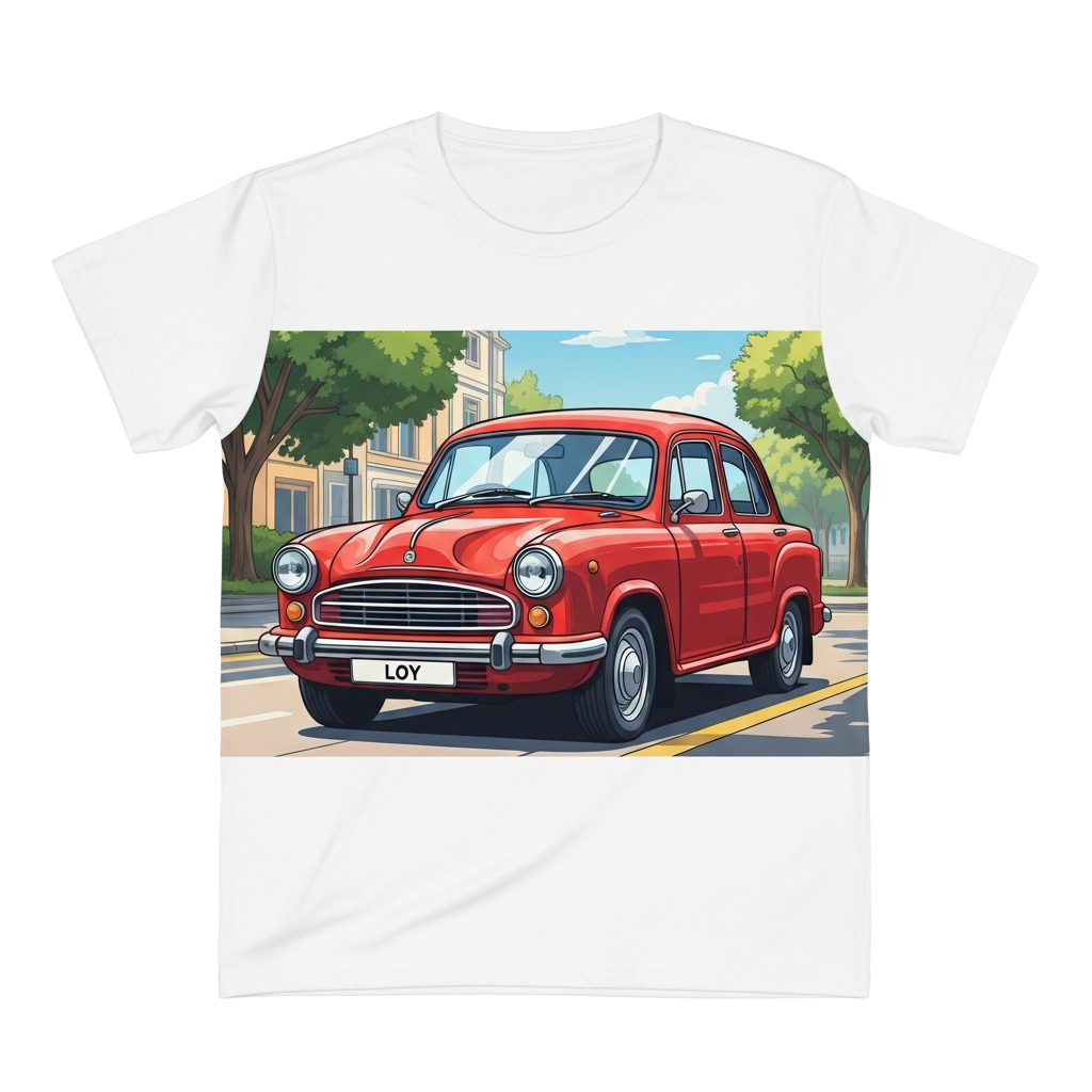 "A highly detailed, realistic illustration of a vibrant red vintage car, like a classic Indian Ambassador, parked on a sunny street. The name "Loy" is subtly integrated onto the license plate. The background is a soft, slightly blurred street scene with trees and buildings, rendered in a bright, inviting palette."
