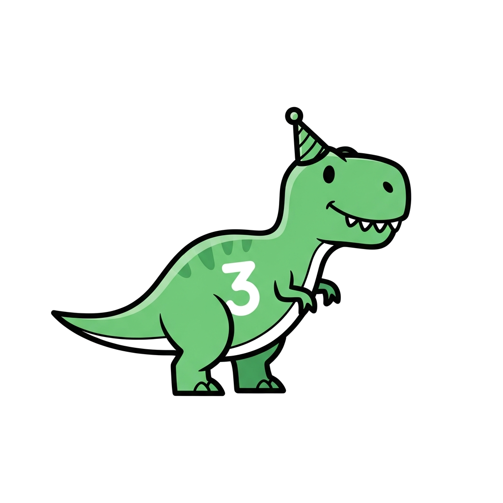 "A sleek, minimalist illustration of a friendly T-Rex silhouette in a soft green, wearing a tiny, modern party hat. The number '3' is subtly integrated into its body or tail. Clean lines, simple shapes, pastel color palette, isolated graphic."