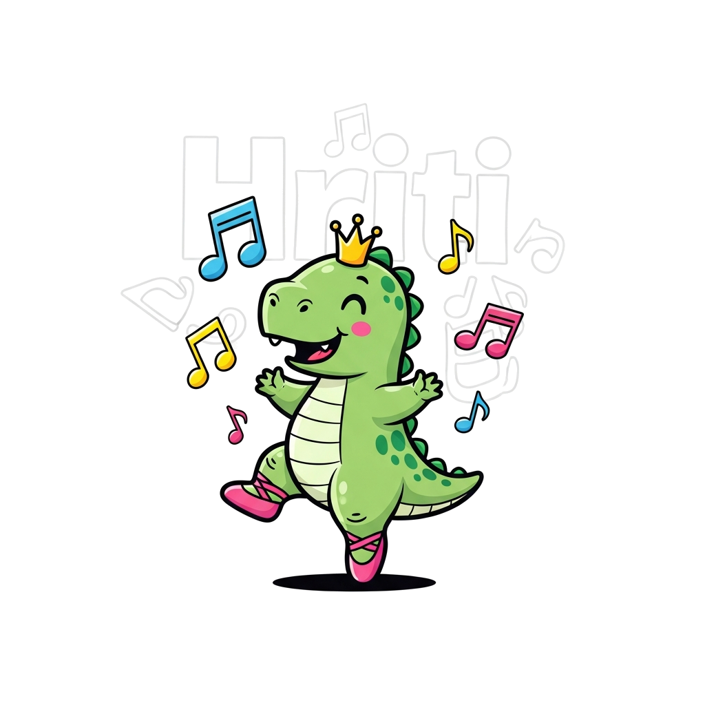 "A cute cartoon baby dinosaur wearing a tiny crown and ballet shoes, dancing happily with musical notes floating around, vibrant and playful style, with the name 'Hriti' subtly integrated into the background elements."