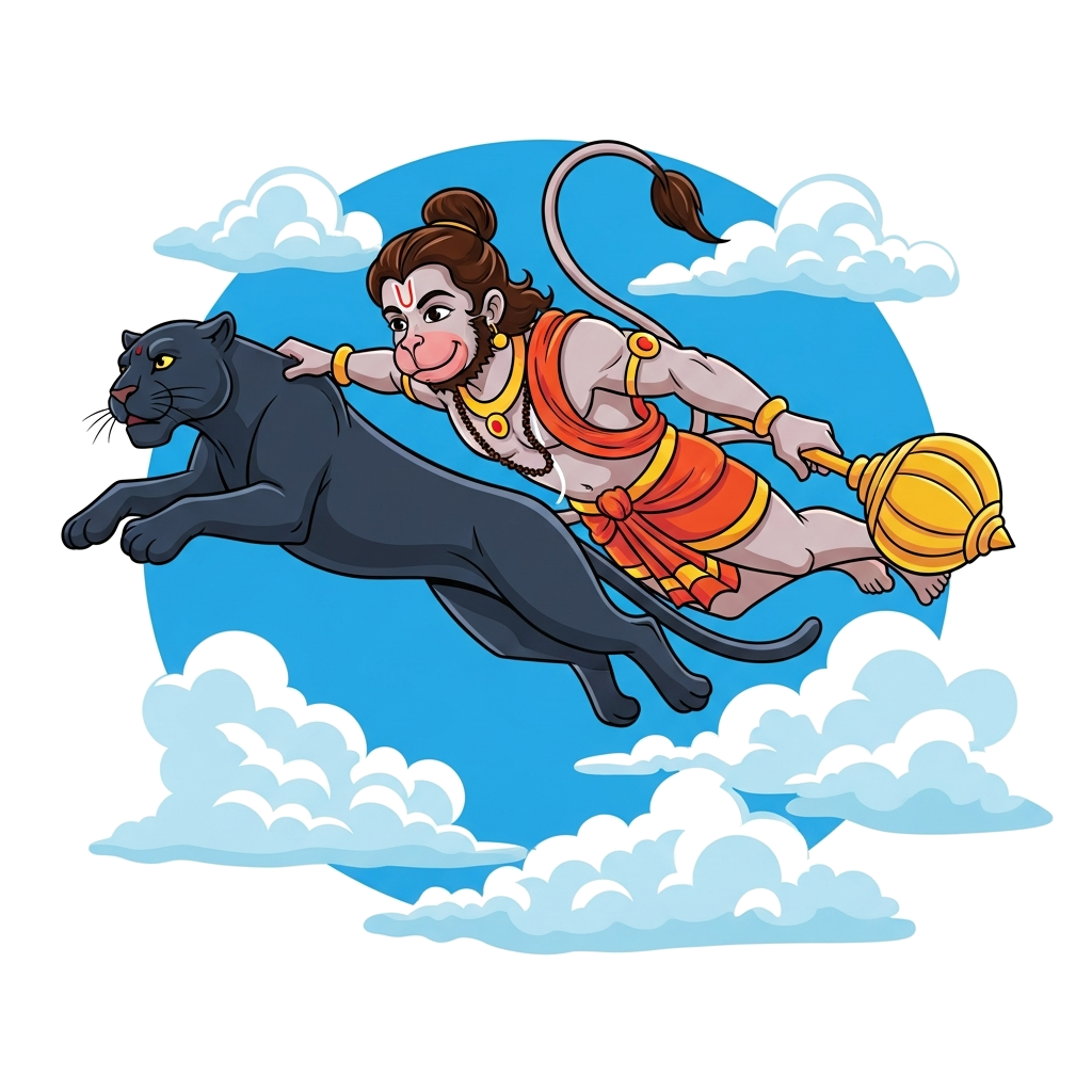 "A dynamic cartoon illustration of Lord Hanuman flying gracefully through the sky, with a sleek, powerful Black Panther leaping alongside him, both with determined and friendly expressions. Vibrant blue sky and fluffy white clouds in the background, bold and colorful style."