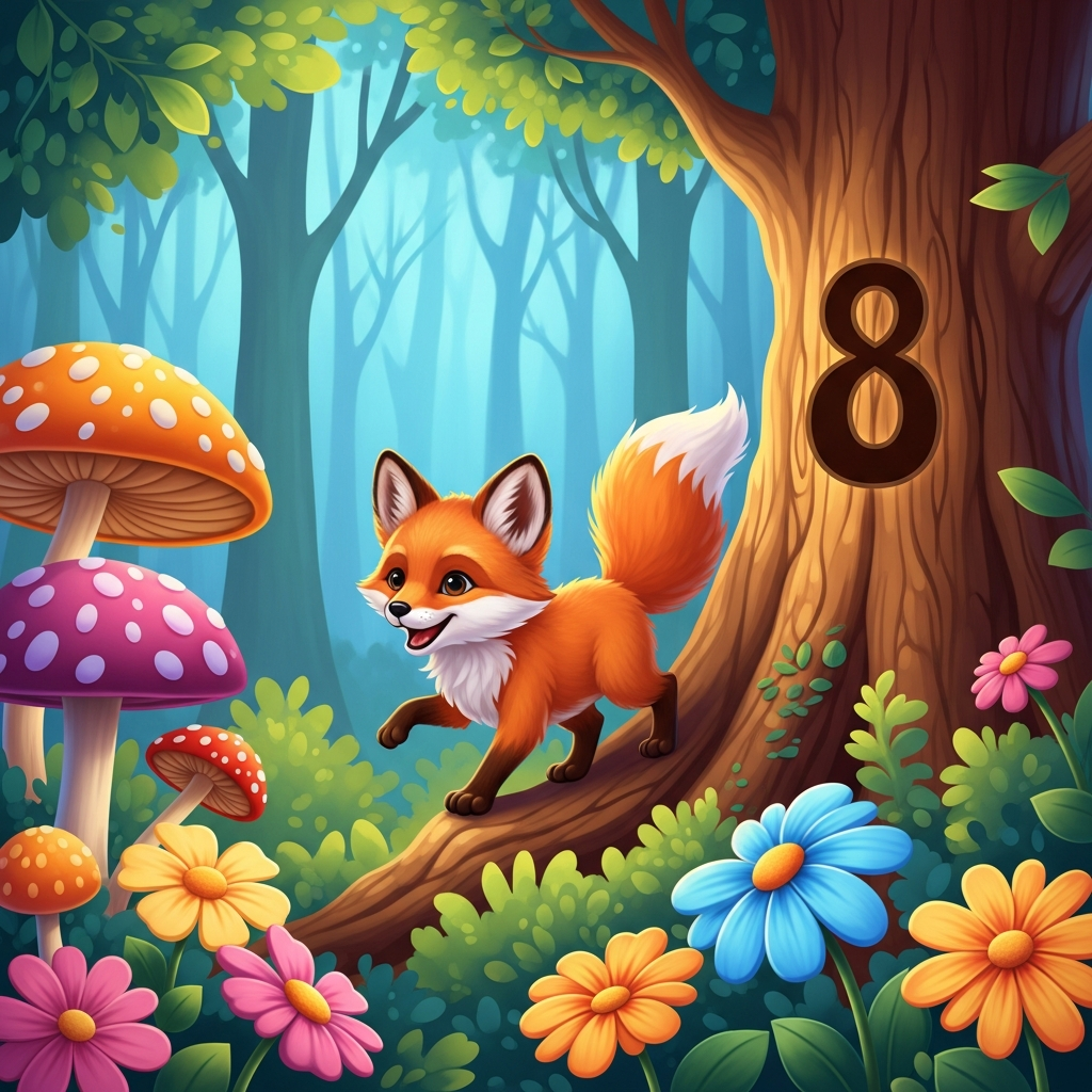 "A vibrant and cheerful illustration of a playful fox cub exploring a lush, colorful forest, surrounded by oversized, brightly colored mushrooms and flowers, with the number '8' subtly integrated into a tree trunk. Cartoon style, highly detailed."