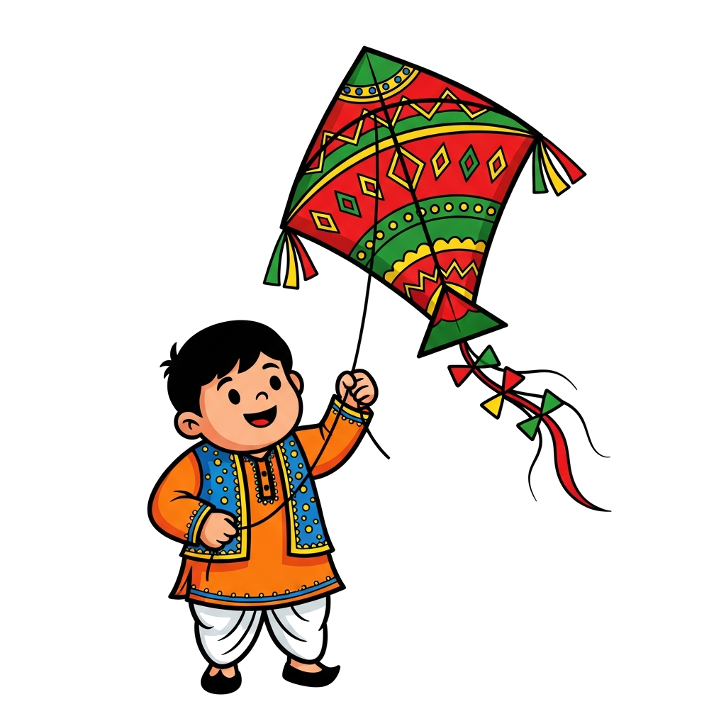 "Indian boy in a colorful kurta playing with a festive kite"