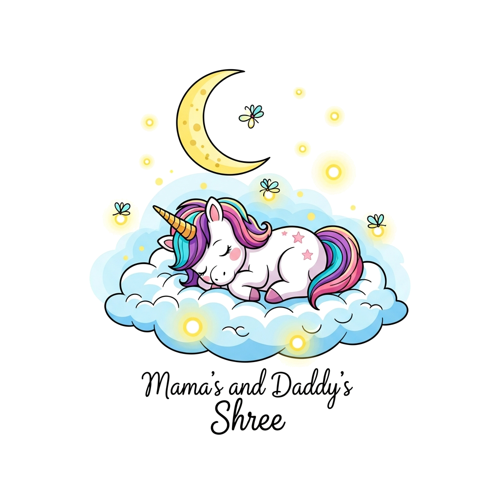 "An enchanting scene of a baby unicorn sleeping peacefully on a cloud, surrounded by glowing fireflies and a crescent moon. The illustration features soft, ethereal lighting and the text 'Mama's and Daddy's Shree' in a delicate script."