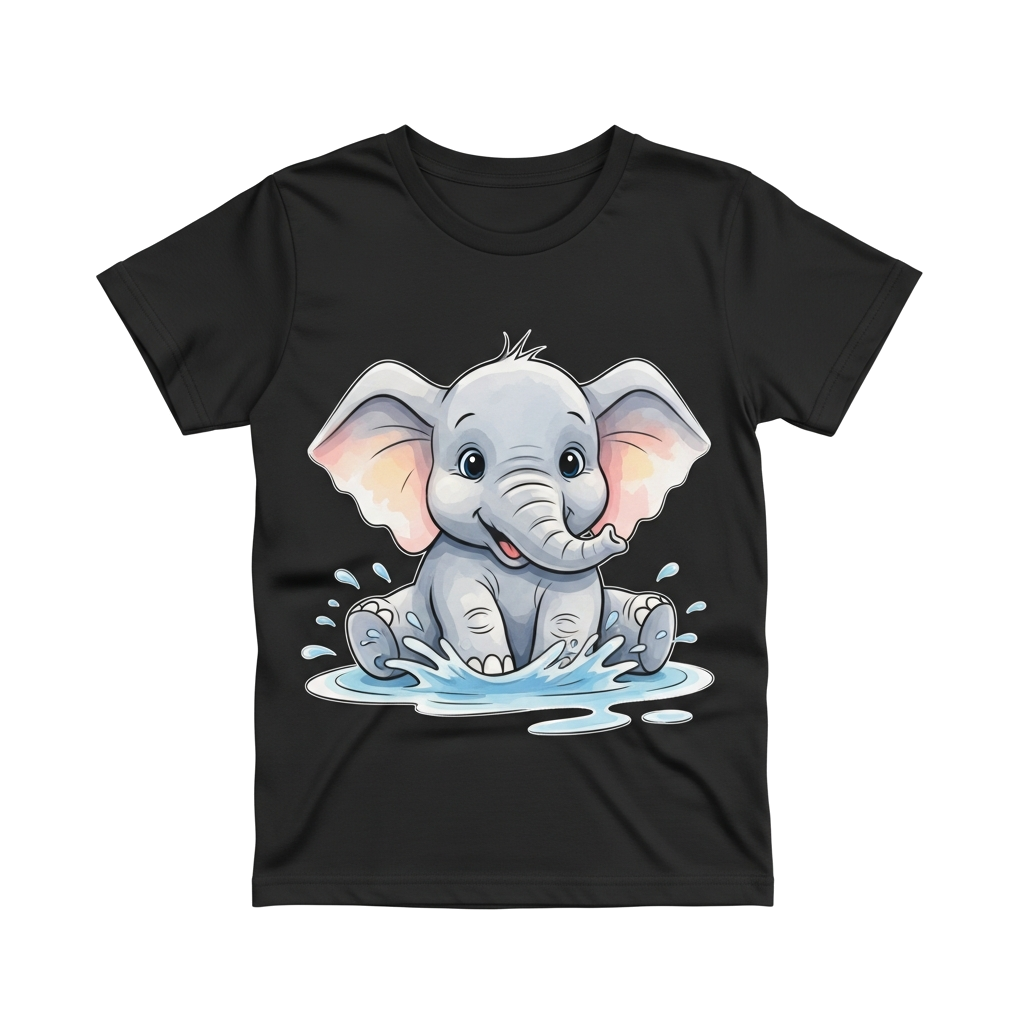 "A whimsical baby elephant splashing in a puddle, painted in soft watercolor strokes, with pastel colors and a playful, cheerful expression."
