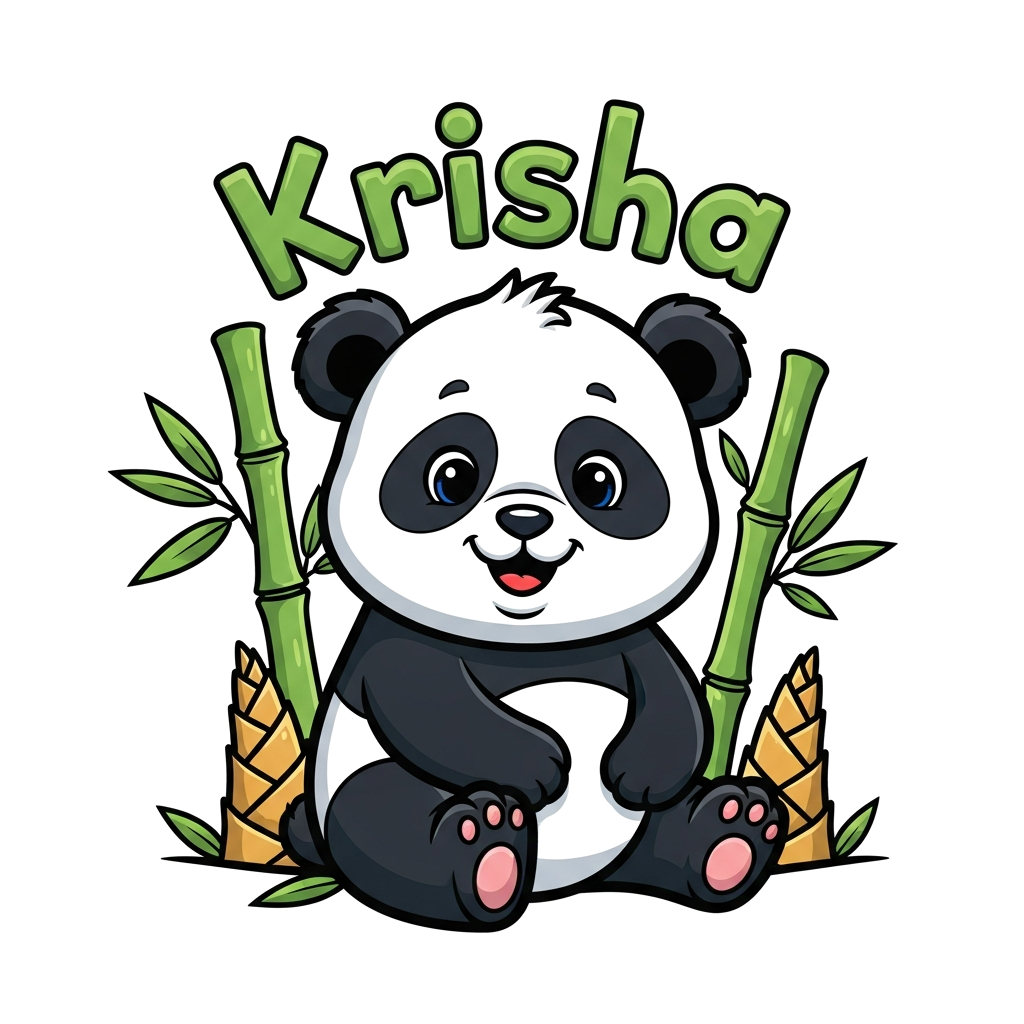 "A super cute cartoon baby panda sitting happily, surrounded by bamboo shoots and leaves, with the name 'Krisha' playfully integrated above it, in a vibrant, child-friendly illustration style."