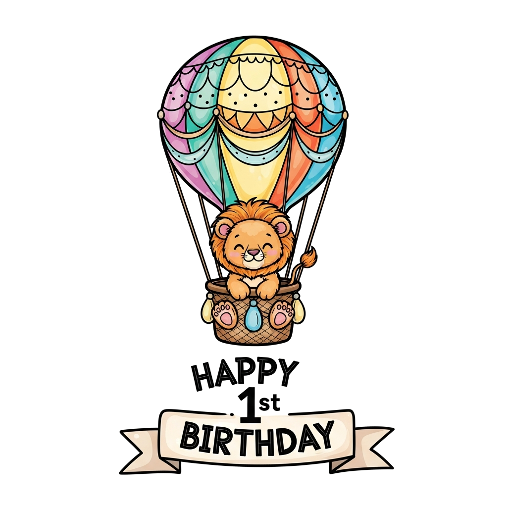 "A whimsical illustration of a soft, fluffy baby lion cub sitting in a magical, colorful hot air balloon, floating above a dreamy landscape. A banner hangs from the balloon saying 'Happy 1st Birthday'. The art style is gentle storybook with vibrant, bright colors and soft textures."