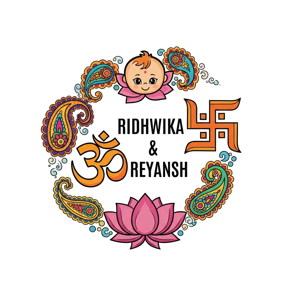 "A playful traditional Indian design with stylized baby characters representing 'RIDHWIKA & REYANSH' peeking from behind a large, decorative Om symbol, adorned with colorful paisley and lotus motifs, set against a backdrop of soft, child-friendly Swastik patterns, joyful and bright."