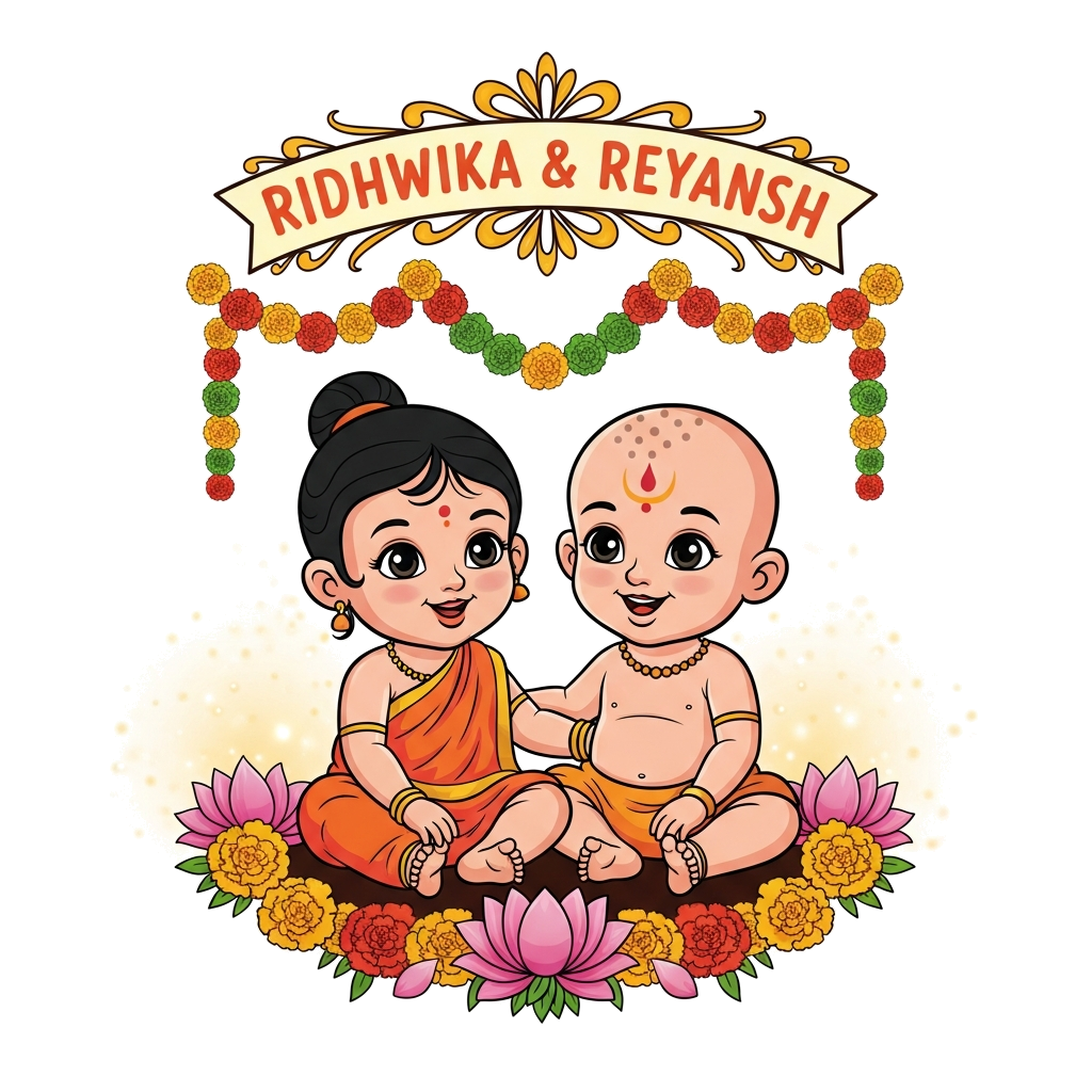 "A heartwarming illustration in traditional Indian art style, showcasing a bald Indian baby girl (Ridhwika) and a bald Indian baby boy (Reyansh) sitting peacefully. They are framed by an exquisite garland of marigold flowers and lotus petals, with a gentle, celebratory glow. In the foreground, a beautifully adorned traditional plate or a small decorative scroll prominently features the text 'RIDHWIKA & REYANSH' in an elegant, child-friendly script. The scene uses warm and inviting colors."