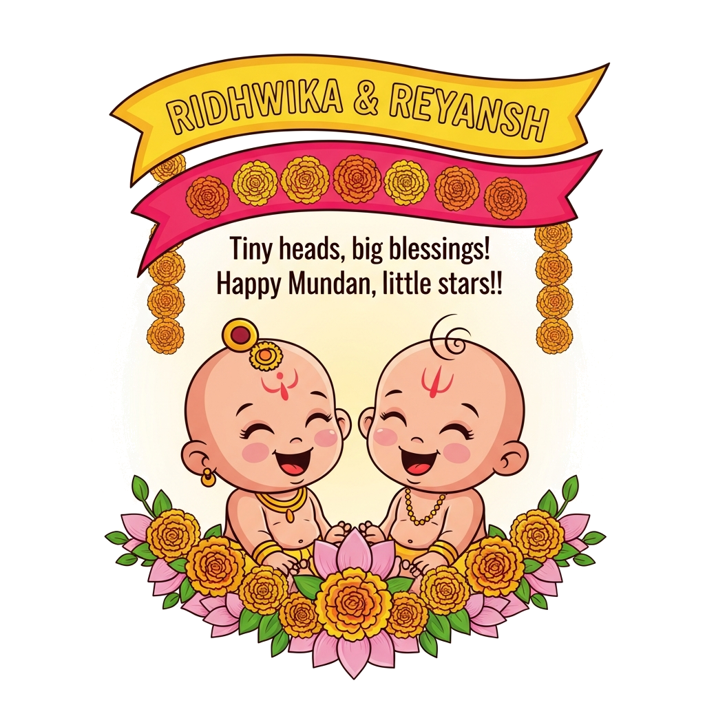 "A vibrant illustration in a traditional Indian folk art style, featuring a joyful bald Indian baby girl (Ridhwika) and a bald Indian baby boy (Reyansh) sitting side-by-side, both with rosy cheeks and wide, happy smiles. They are lovingly framed by a lush, intricate garland of bright marigold flowers and delicate lotus petals. A graceful, unfurling scroll, subtly woven into the lower part of the garland, elegantly displays the quote 'Tiny heads, big blessings! Happy Mundan, little stars!!' in a flowing script. Above the babies, a festive banner in warm tones proudly presents 'RIDHWIKA & REYANSH' in a playful, golden script. The overall palette is rich with celebratory yellows, oranges, and fuchsia pinks, set against a soft, glowing background."