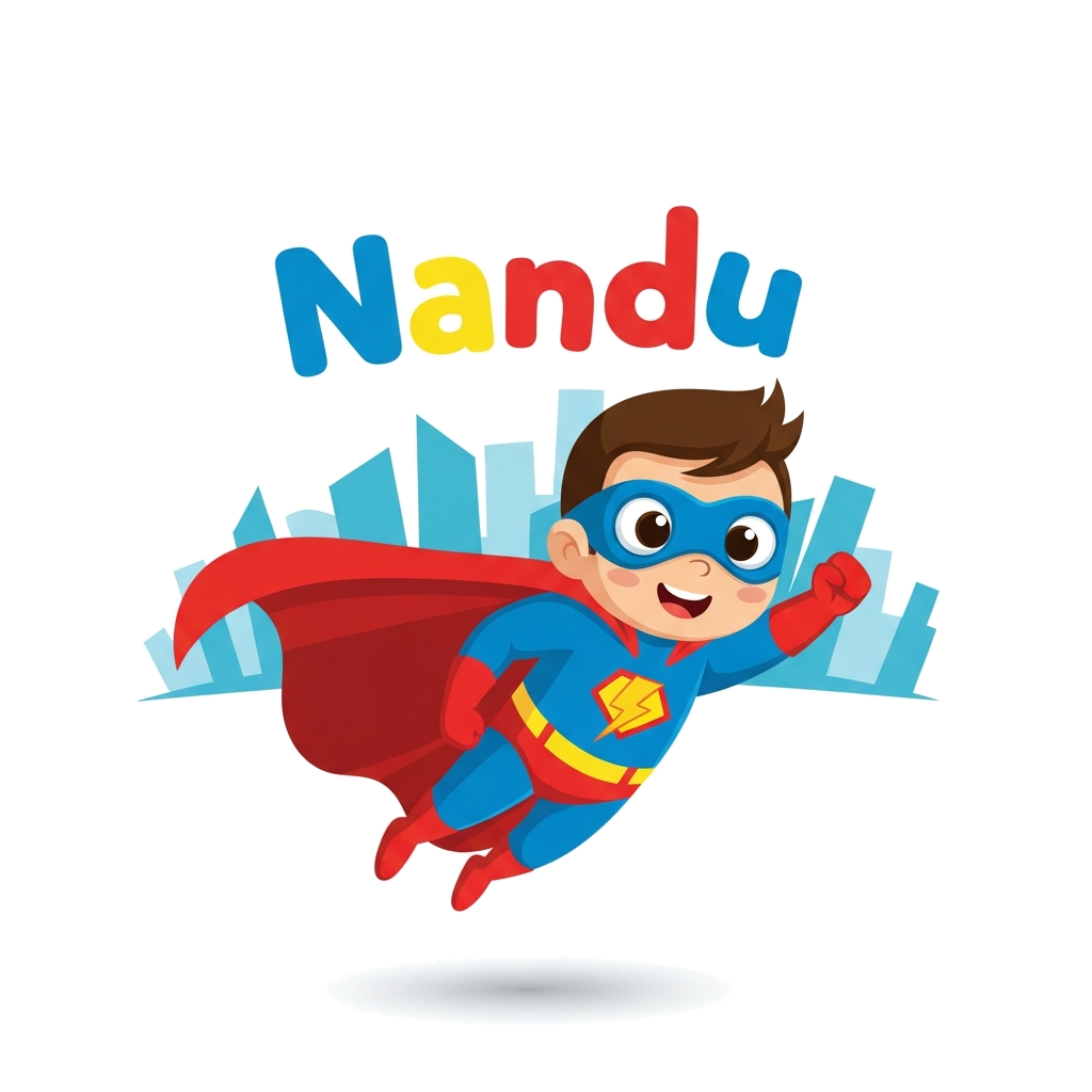 "A cute cartoon superhero character, flying with a cape, with the name 'Nandu' subtly integrated into the background or on a small emblem, vibrant and playful style."