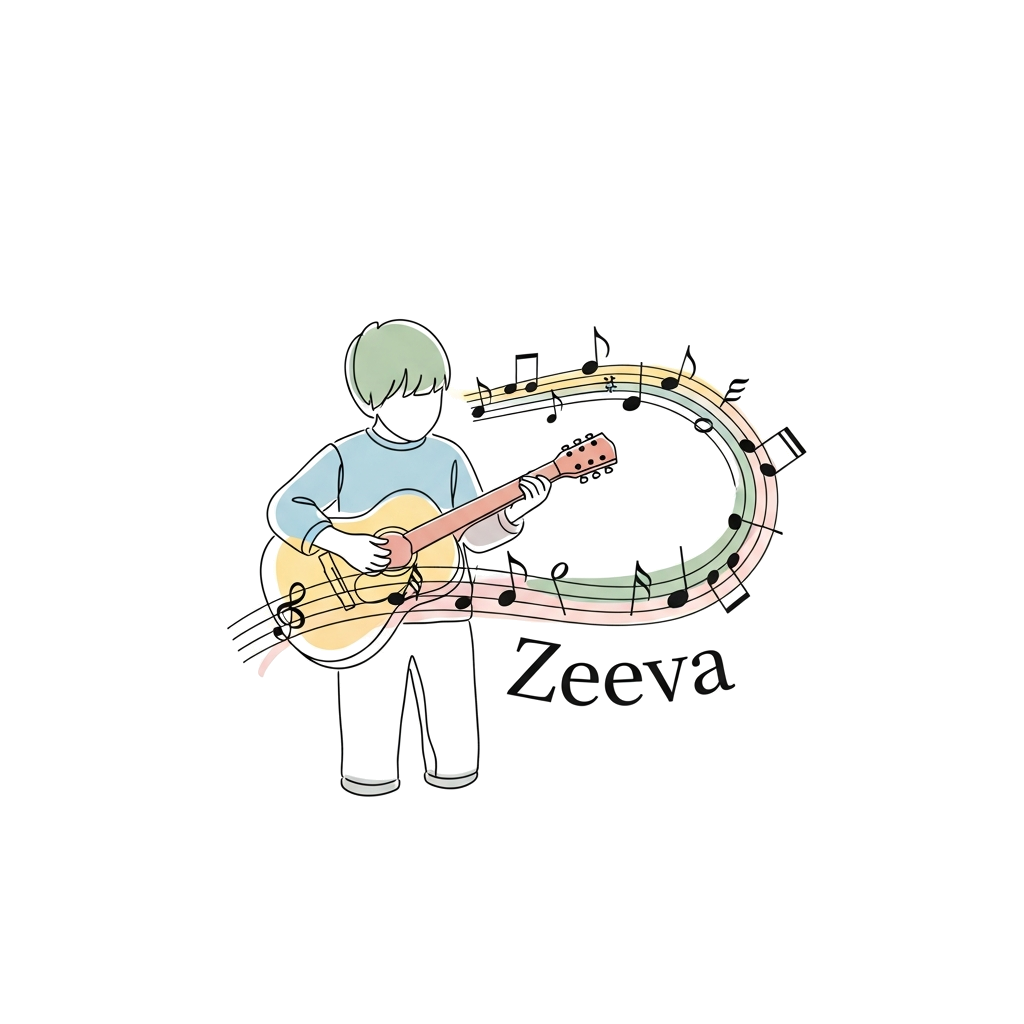 "A minimalist line art illustration of a child playing a guitar, with musical notes gently swirling around, in a soft pastel color palette, with the name 'Zeeva' subtly integrated into the design, artistic and clean style."