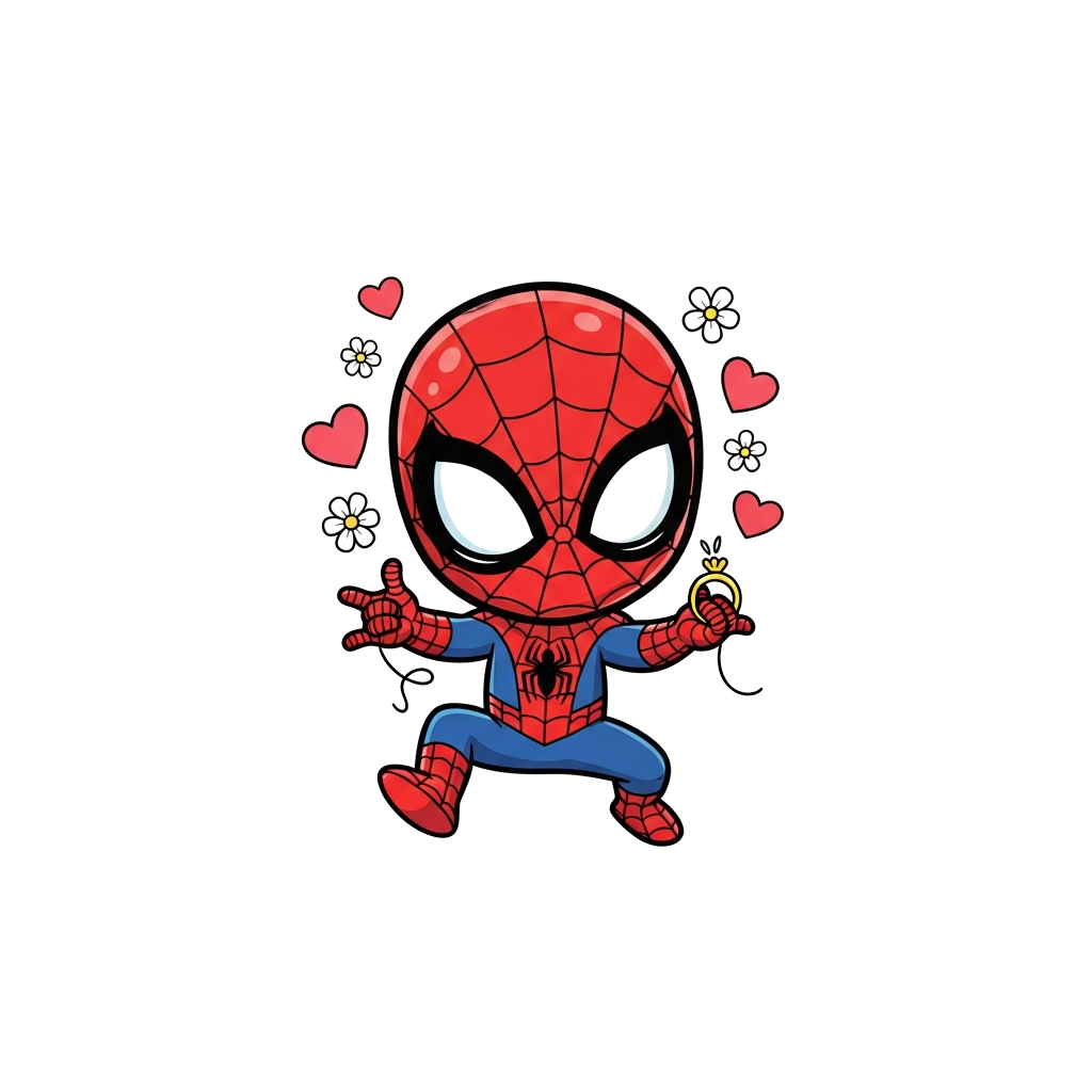 "A super cute cartoon Spider-Man, with big friendly eyes, playfully holding a tiny wedding ring on a web string, surrounded by floating hearts and delicate white flowers, vibrant and cheerful style."