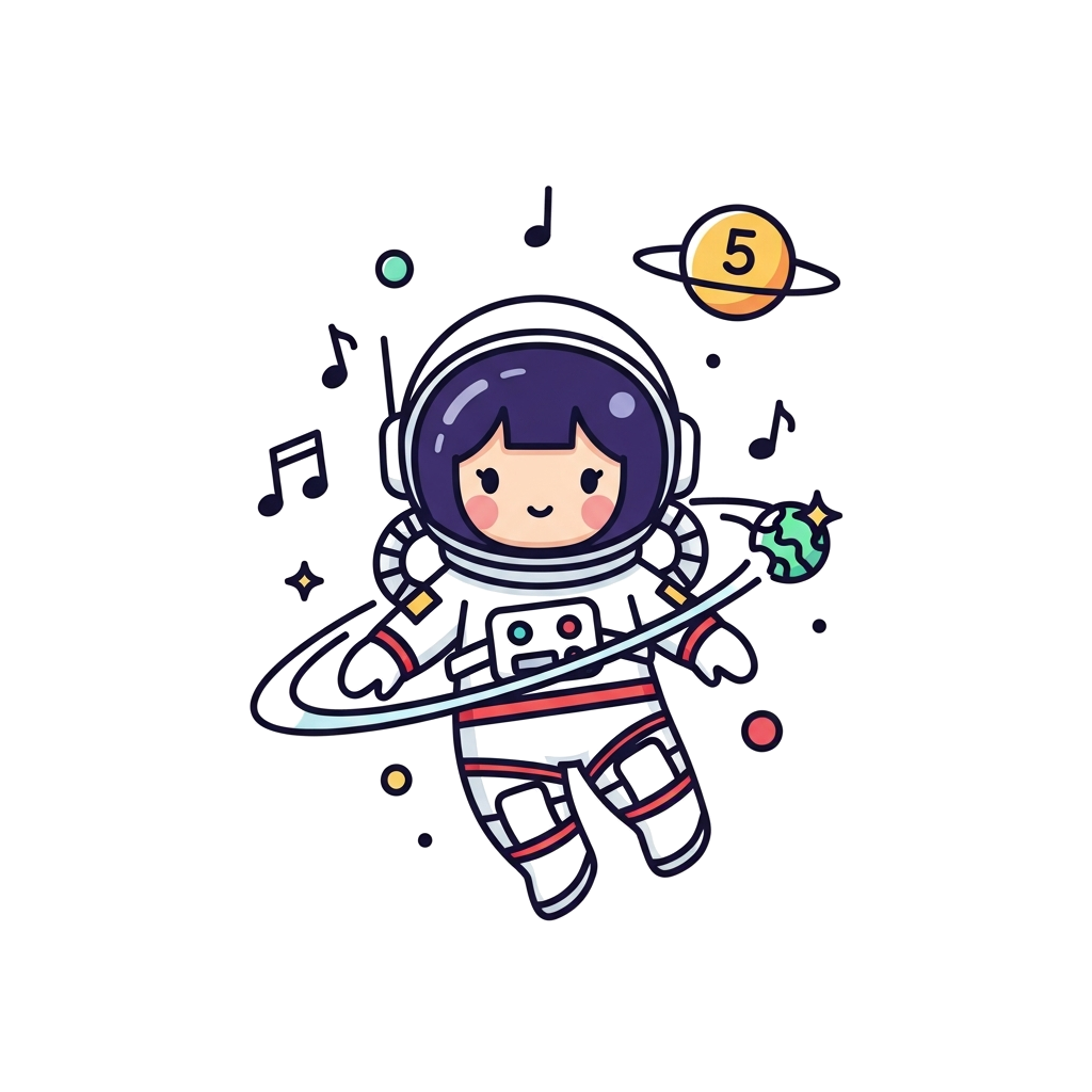 "A minimalist illustration of a cute astronaut girl floating in space, surrounded by musical notes and stylized planets, with the number 5 subtly integrated, clean lines, modern design, soft color palette."