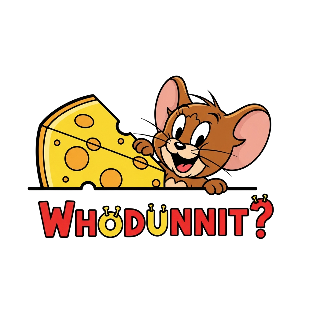 "A cute and playful cartoon illustration of Jerry the mouse, peeking out from behind a giant slice of cheese with a mischievous grin, and the text 'Whodunnit?' playfully integrated into the scene, vibrant colors, clean lines, child-friendly style."