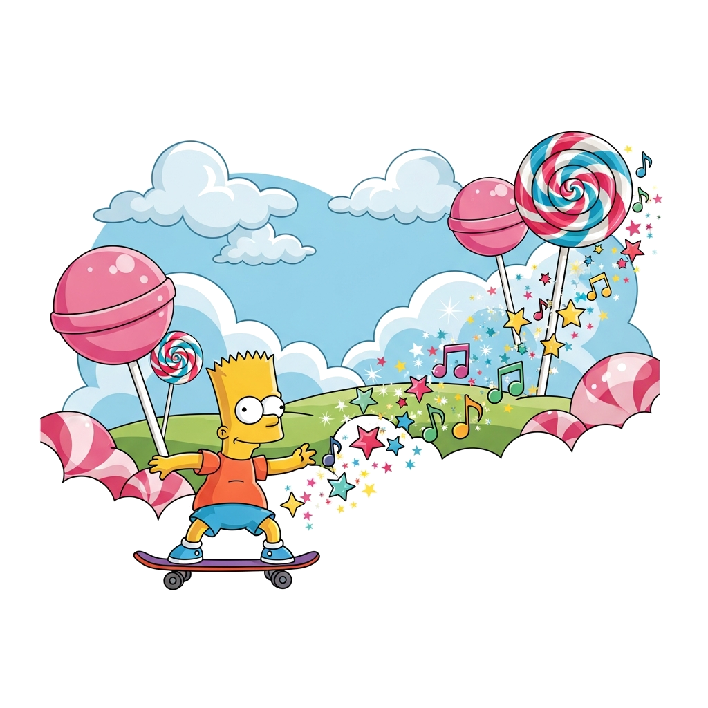 "A whimsical illustration of Bart Simpson riding his skateboard, leaving a trail of colorful, sparkling stars and musical notes. The background is a dreamy landscape with candy-colored clouds and giant lollipops, in a playful cartoon style with soft, rounded edges."
