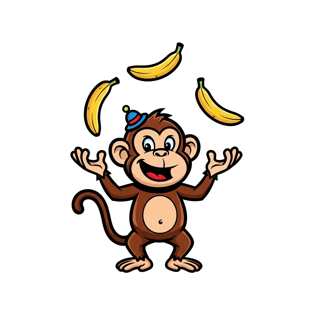 "A mischievous cartoon monkey wearing a tiny hat, juggling three colorful bananas with a silly grin, vibrant and playful style."
