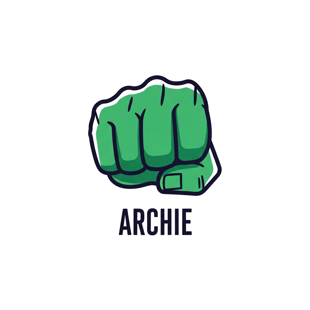 "A minimalist graphic illustration of a powerful green superhero fist, stylized with clean lines and a modern aesthetic, with the name 'Archie' integrated seamlessly below the fist, on a plain white background, child-friendly."