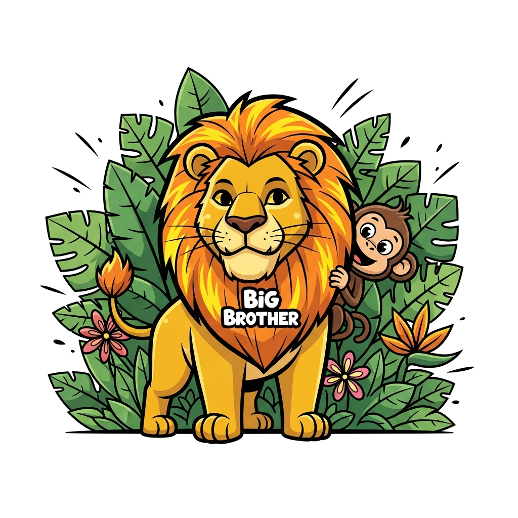 "A bold and cool cartoon illustration of a confident lion standing proudly, with a playful baby monkey peeking out from behind him, in a vibrant jungle setting with green leaves and a hidden 'Big Brother' text integrated into the design, dynamic lines."