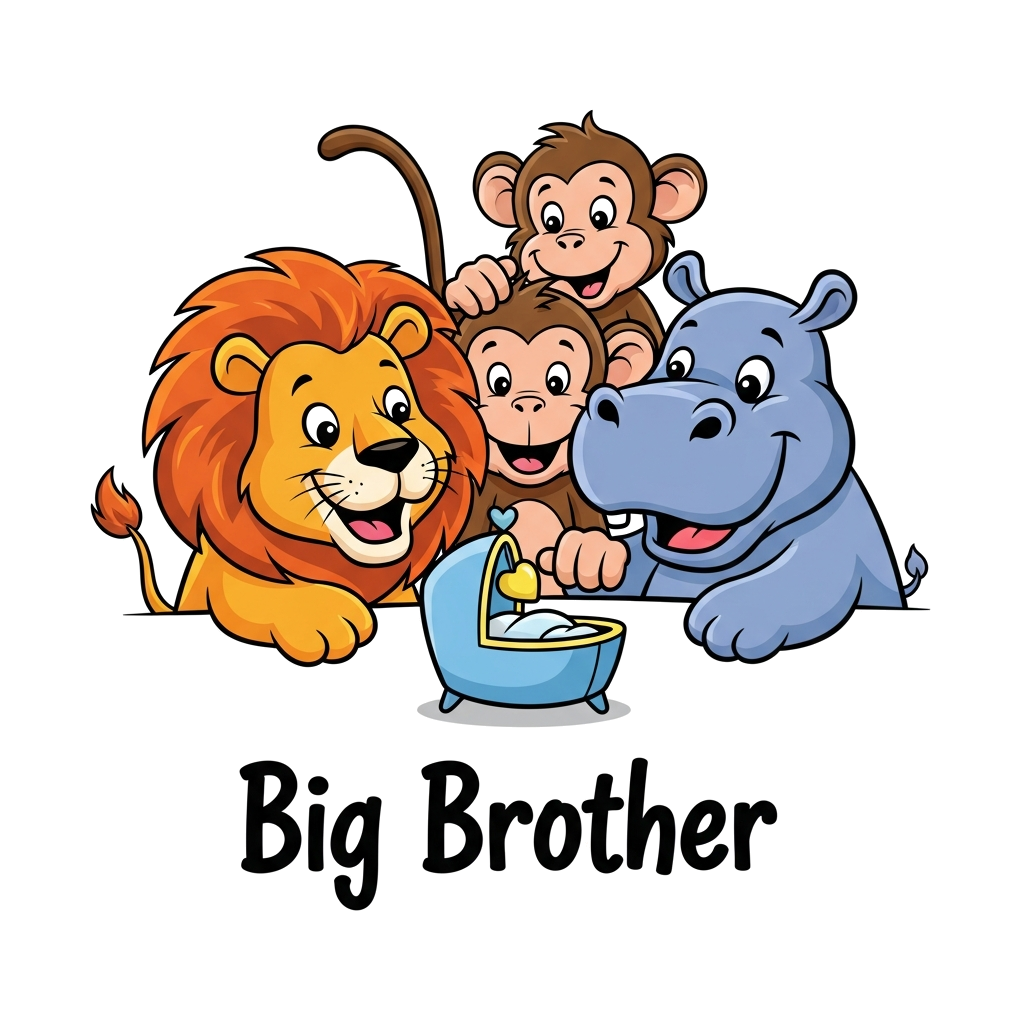 "A charming cartoon illustration of a friendly lion, a playful monkey, and a cheerful hippo gathered together, all looking excitedly at a tiny, empty cradle or a 'baby on the way' sign, with 'Big Brother' text in a whimsical font."