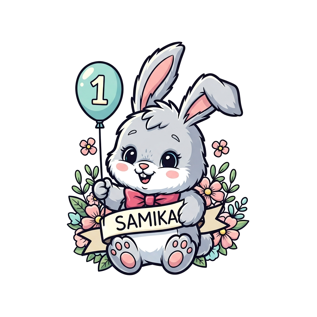 "A super cute, fluffy baby bunny illustration, holding a tiny balloon with the number '1' on it, surrounded by soft pastel flowers and a banner subtly saying 'Samika', in a cheerful, whimsical cartoon style with soft colors."