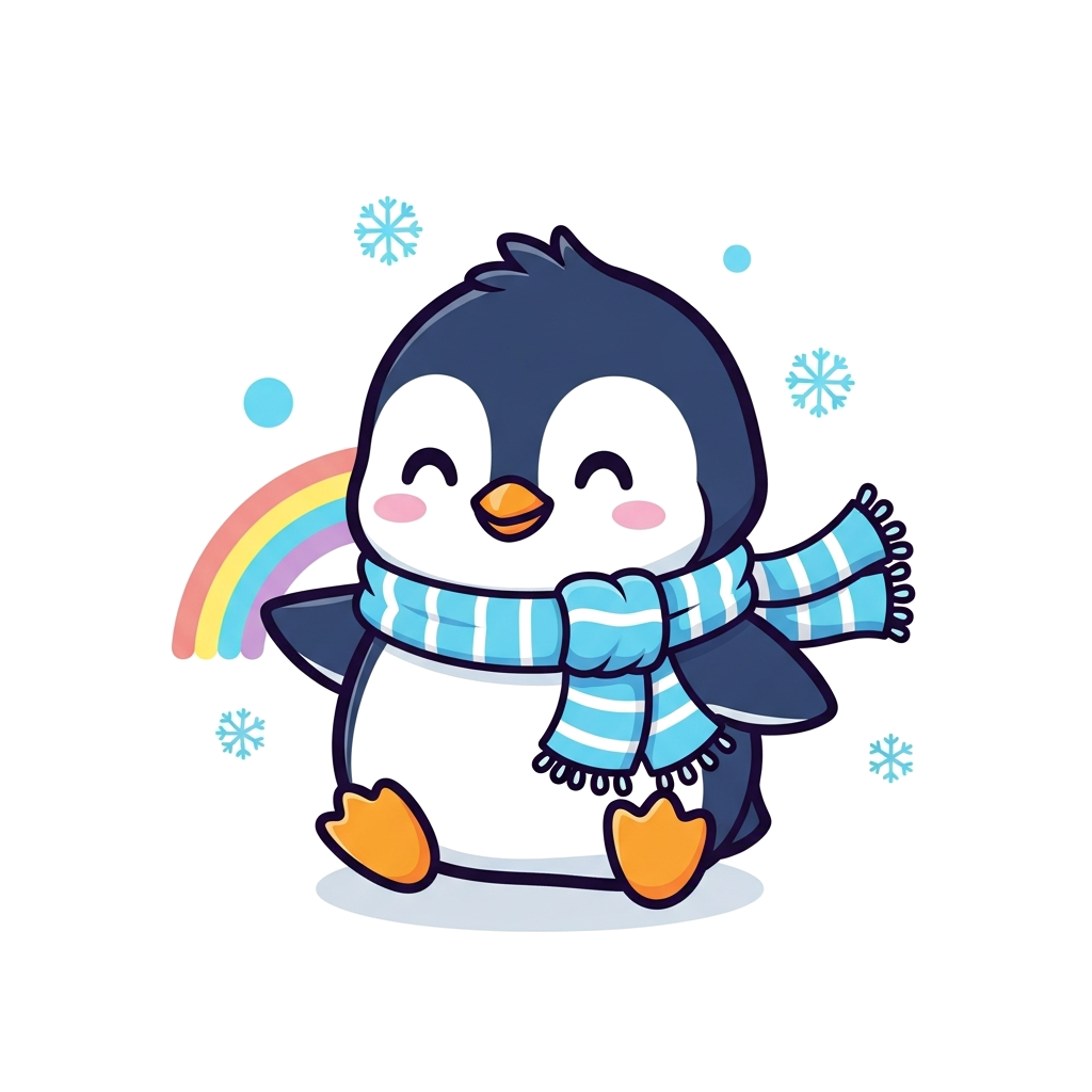 "A super cute, chibi-style cartoon penguin waddling happily, surrounded by tiny snowflakes and a pastel rainbow, in a bright and friendly illustration."