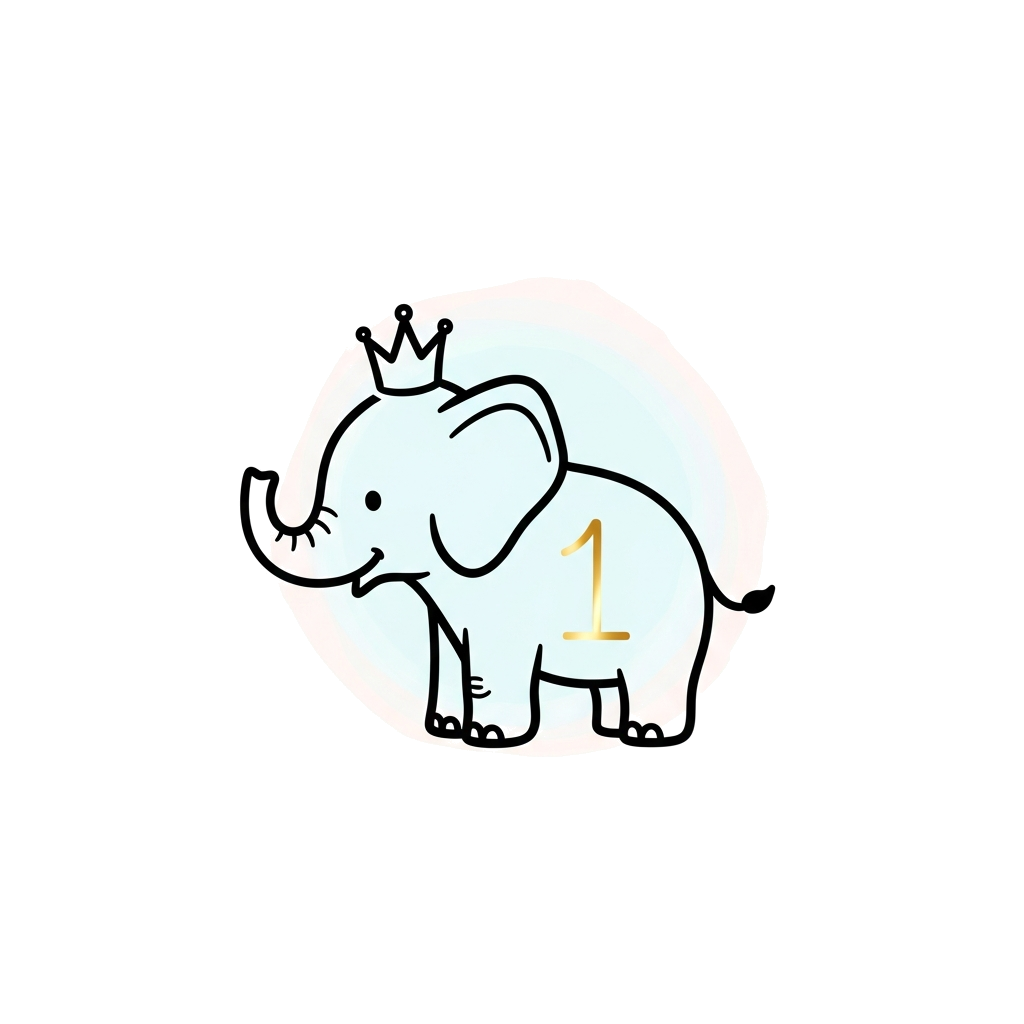 "A single, elegantly simple line art illustration of a baby elephant wearing a tiny, delicate crown. The number '1' is subtly integrated into the design, perhaps as a negative space or a simple golden line. The background is clean and soft, with a hint of pastel watercolor."