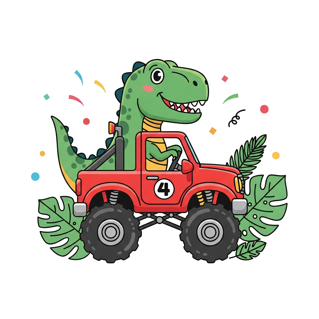 "A cute cartoon T-Rex driving a bright red monster truck, with the number '4' on the truck's door, surrounded by playful jungle leaves and confetti, vibrant and cheerful style."