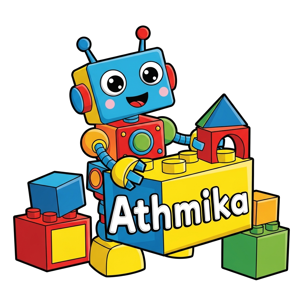 "A very cute, friendly cartoon robot with big, expressive eyes, made of colorful geometric shapes, happily playing with oversized building blocks. The name "Athmika" is playfully integrated into one of the blocks. Vibrant colors and a cheerful, playful illustration style."