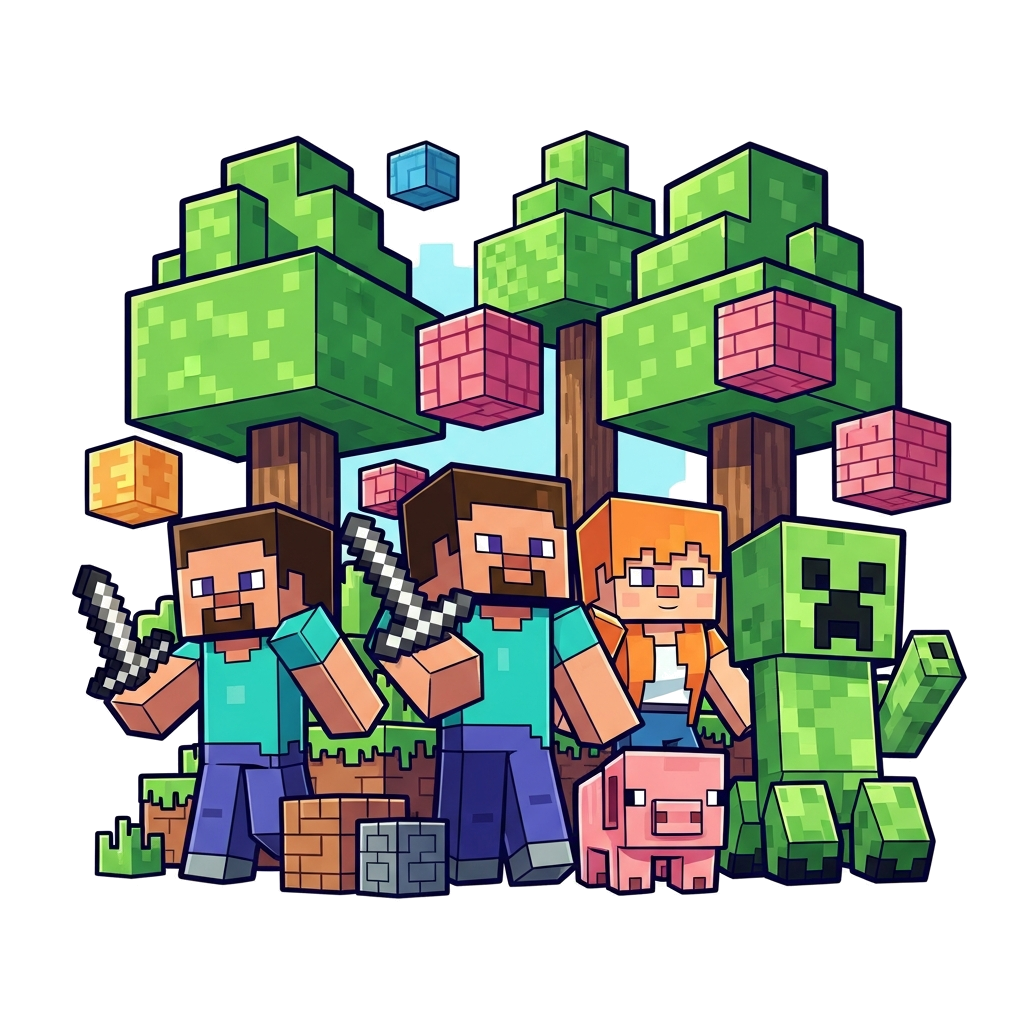 "A vibrant and playful scene featuring popular Minecraft characters like Steve, Alex, a Creeper, and a Pig, all in a cute, slightly cartoonish style, surrounded by colorful blocks and pixelated trees, in a bright, cheerful setting."
